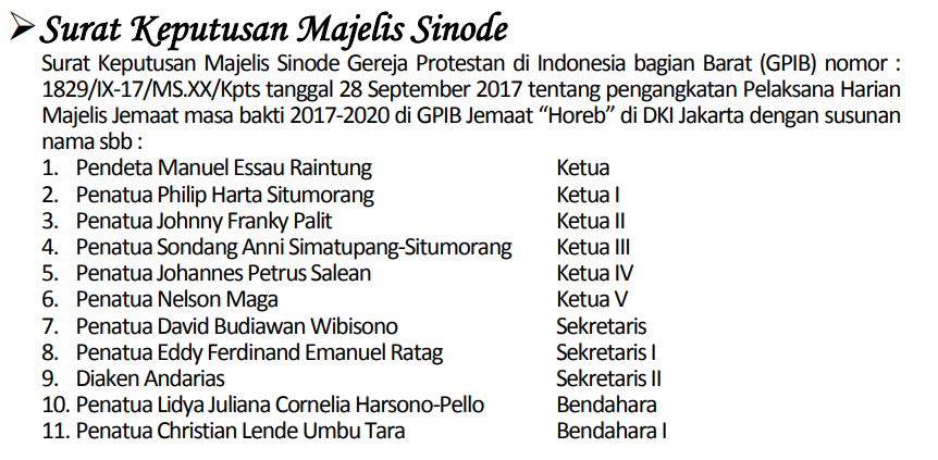 21 Oct 2017 PELAKSANA HARIAN MAJELIS JEMAAT GPIB ’HOREB’ di DKI JAKARTA PERIODE TAHUN 2017-2020 by ptrc | posted in: PHMJ | 0